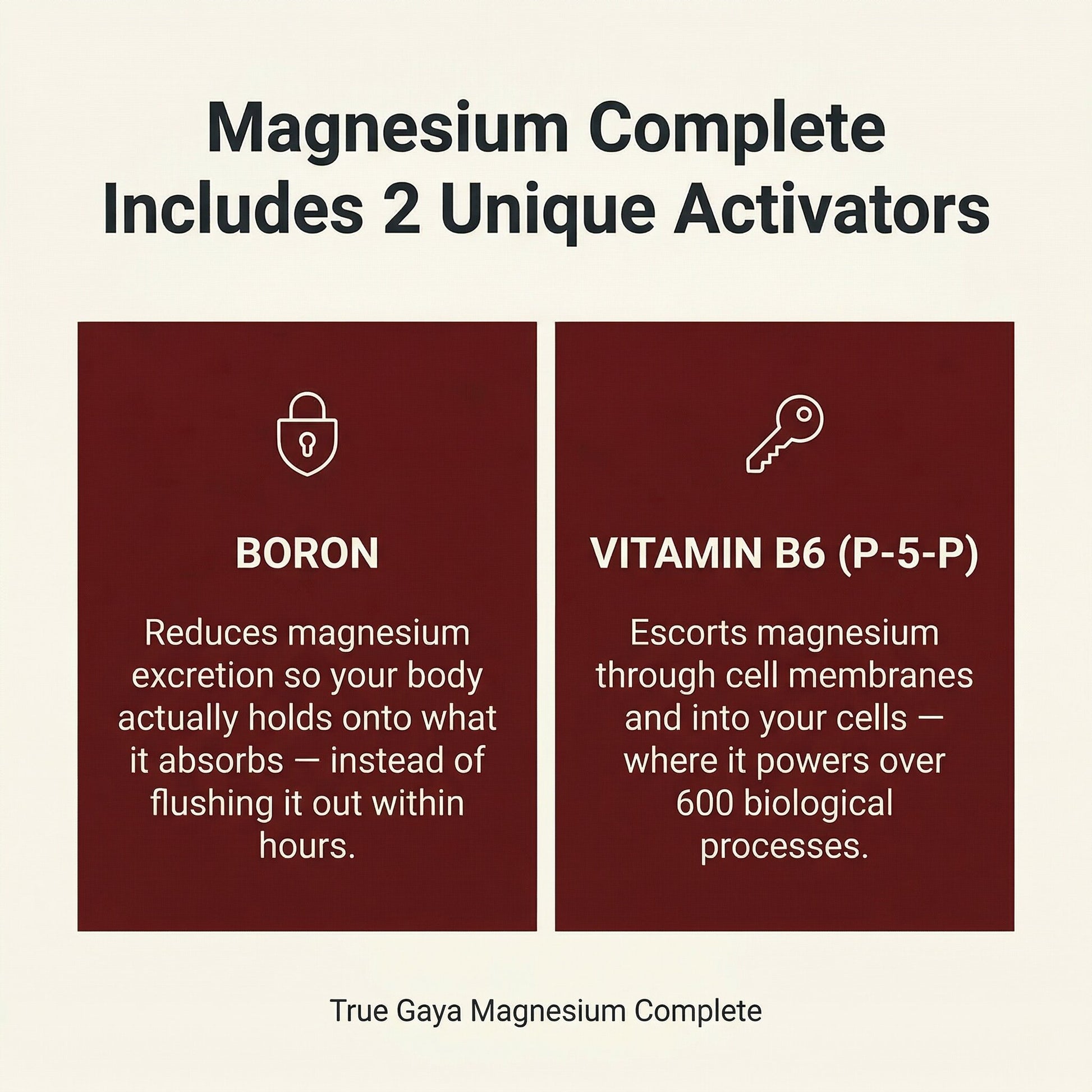 Even the best magnesium gets flushed out within hours. Boron reduces magnesium excretion so your body actually holds onto what it absorbs — long enough to work.