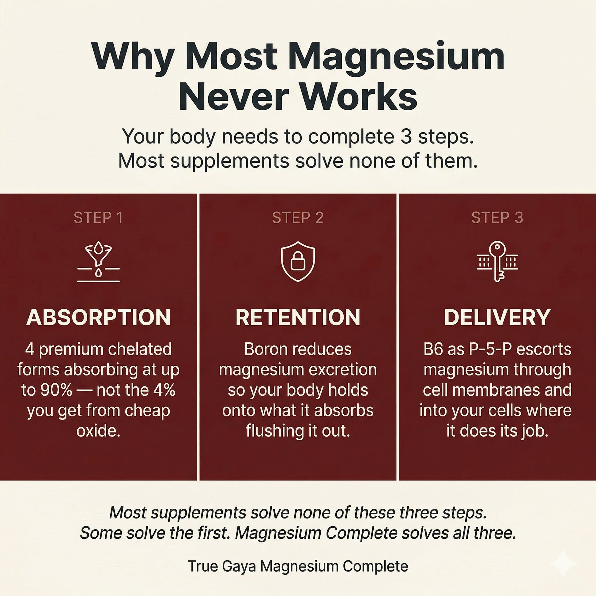 This is the question that separates Magnesium Complete from everything else. You can take the most absorbable forms of magnesium in the world and still not feel much — because absorption is only step one of three. Step two is retention: your kidneys treat excess magnesium as waste and excrete it within hours.